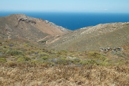 Při stoupání do sedla Axina (330 m n m.) se otevírají četné výhledy, samozřejmě především na Kasteli a Kalamos na jihovýchodě a na nejvyšší vrchol ostrova, kterým je Vigla (581 m) na severozápadě. Ze sedla samotného, skoro přesně uprostřed ostrova, se otevře výhled na sever a člověk by si naivně myslel, že by tam mohlo být zeleněji. Opak je pravdou, prý za to může prudký vítr, který všechno vyfouká. Je odtud jen pěkný výhled na ostrov Amorgos a na Malé Kyklady. U částečně opravené ruiny kostela sv. archanděla Michaela jsme to raději otočili a pokorně se vrátili do útulné Chóry, poněkud zmoženi sluncem, větrem a všeobecnou vyprahlostí.