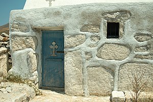 Kostel je přistavěný ke zbytku velice masivní zdi, kterou najdeme z druhé strany, za vchodem. Kolem je vícero kamenných pozůstatků, asi z různých epoch, a je odtud krásný výhled na moře s menšími ostrůvky. Nejspíš tu býval hřbitov a jižní (dolní) okraj antického města.